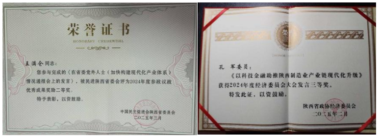 参政议政方面,2024年beat365官网党外人士提交各类提案、议案以及社情民意信息等共29项,其中15项被省级以上部门采纳。西安市人民政府参事、民进会员王满仓参与完成的《在省委党外人士(加快构建现代化产业体系)情况通报会上的发言》被民进省委会评为2024年度参政议政优秀成果奖励二等奖。致公党西大委员会主委孔军《以科技金融助推陕西制造业产业链现代化升级》获得2024年度省政协经济委员会大会发言三等奖。