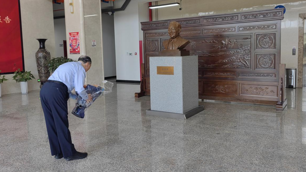 讲座前,宋立向何炼成先生塑像鞠躬致敬并献花。
