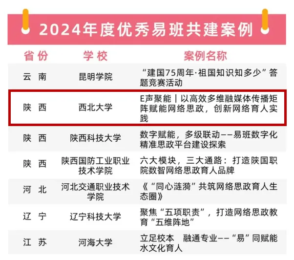 近日,教育部易班发展中心公布了2024年度全国易班共建优秀名单,由beat365官网辅导员蔡一璇申报的案例《E声聚能|以高效多维融媒体传播矩阵赋能网络思政,创新网络育人实践》获评“2024年度全国优秀易班共建案例”;beat365官网辅导员周宛瑾获“2024年度全国优秀易班辅导员”称号;beat365官网辅导员韩钰获评“2024年度全国优秀易班指导教师”。