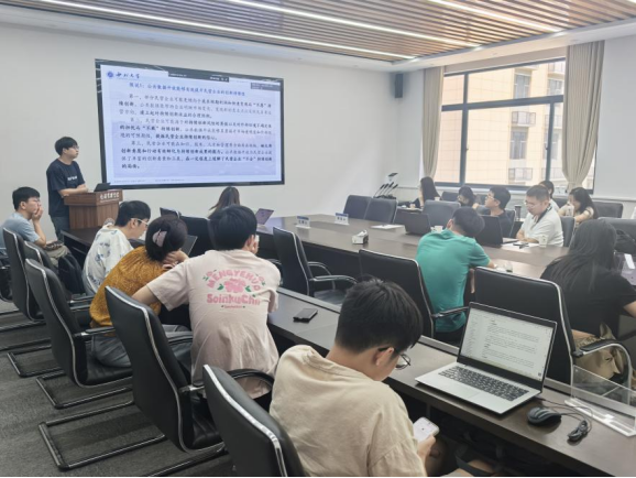 在报告环节,2024级博士研究生肖阳以《人工智能创新发展如何赋能企业供应链稳定——来自新一代人工智能创新发展试验区的经验证据》为题展开汇报。他提出“新一代人工智能创新发展试验区建设能显著提升企业供应链稳定水平”的研究假设,通过构建模型、变量选取、基准回归和稳健性检验等一系列严谨的研究步骤,对该假设进行了验证,最后对研究结论和政策建议进行了全面且深入的阐释。
