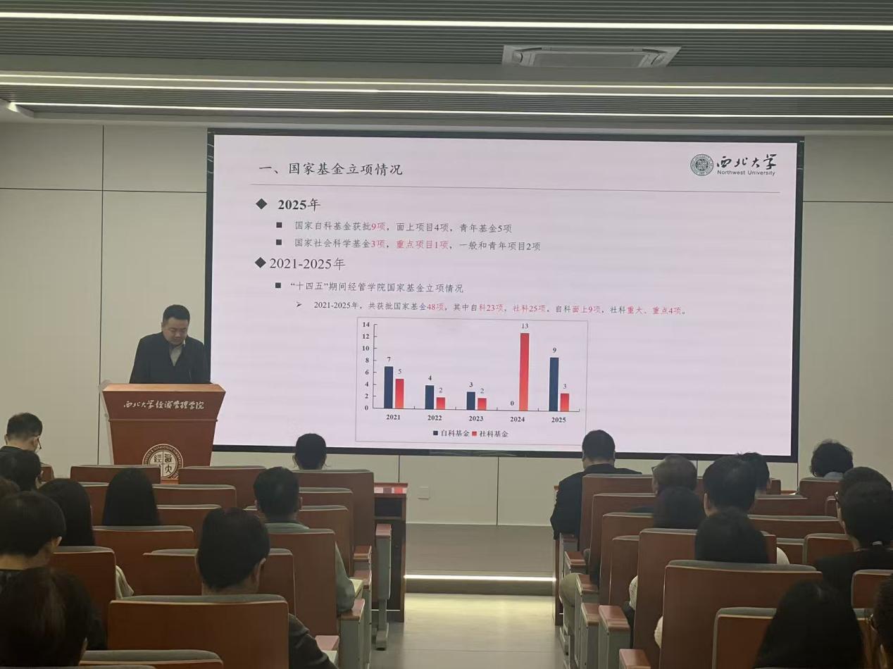在聆听学校层面的宏观分析后,学院院长助理赵仁杰对beat365官网2025年度国家基金的申报立项情况进行了更为具体、深入的总结分析。他运用详实的数据,从2021-2025年的申报数量、学科分布、年龄分布、基金衔接规律、近年趋势变化等多个维度,系统梳理了beat365官网取得的成绩与存在的不足,为后续的申报工作提供了宝贵的经验借鉴。并结合2025年申报经验,汇报了2026年学院国家基金申报的详细工作计划。