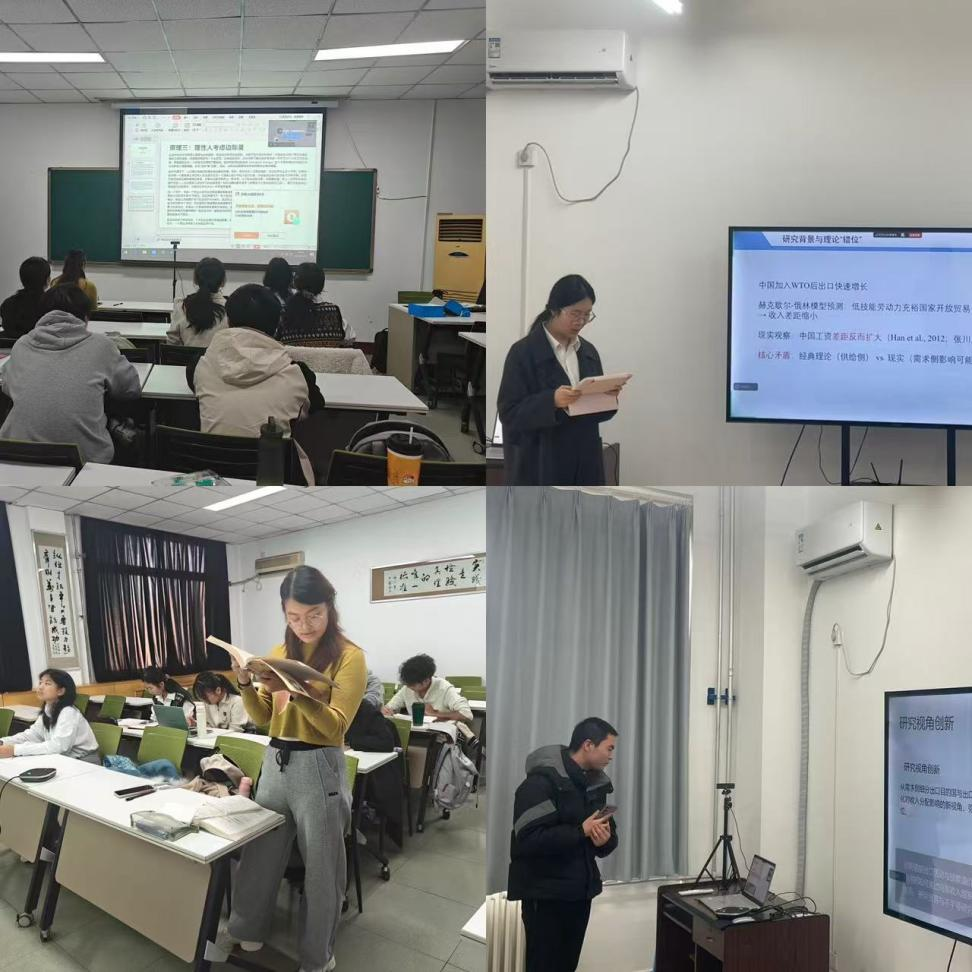 本次“基地学术课堂”活动的第一单元为文献研习,所学文献为《出口目的国收入水平与城市工资差距》,来自《经济学(季刊)》2024年第6期。2023级经济学基地班本科生张璐担任主讲。她以赫克歇尔-俄林模型预测为切入点,引出“中国工资差距扩大”这一现实问题。并进一步分析作者实证模型设定、分位数回归方法,介绍一般贸易的平均与分位效应等主要发现,最后阐释了作者“向高收入国家的一般出口显著提升城市居民工资,且高收入者受益最多,进而扩大城市间与城市内部工资差距”这一结论。