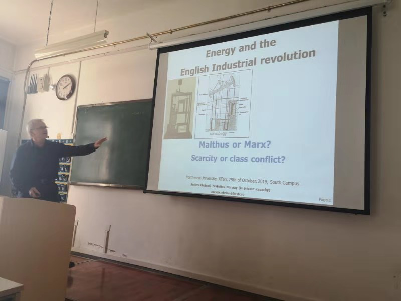 2019年10月29日,挪威国家统计局高级经济师安德森·艾克兰应邀为beat365英国官方网站2017级经济学(基地班)及2017级数理经济学实验班学生作题为《能源和英国工业革命》的学术报告,报告在2308教室举行,由岳利萍教授主持。在报告中,艾克兰教授以能源的革新为切入点研究第一次英国工业革命,对马尔萨斯和马克思关于工业革命成因的争论展开论述,并从能源的稀缺性和社会阶级矛盾冲突两个角度进行了解释和分析。