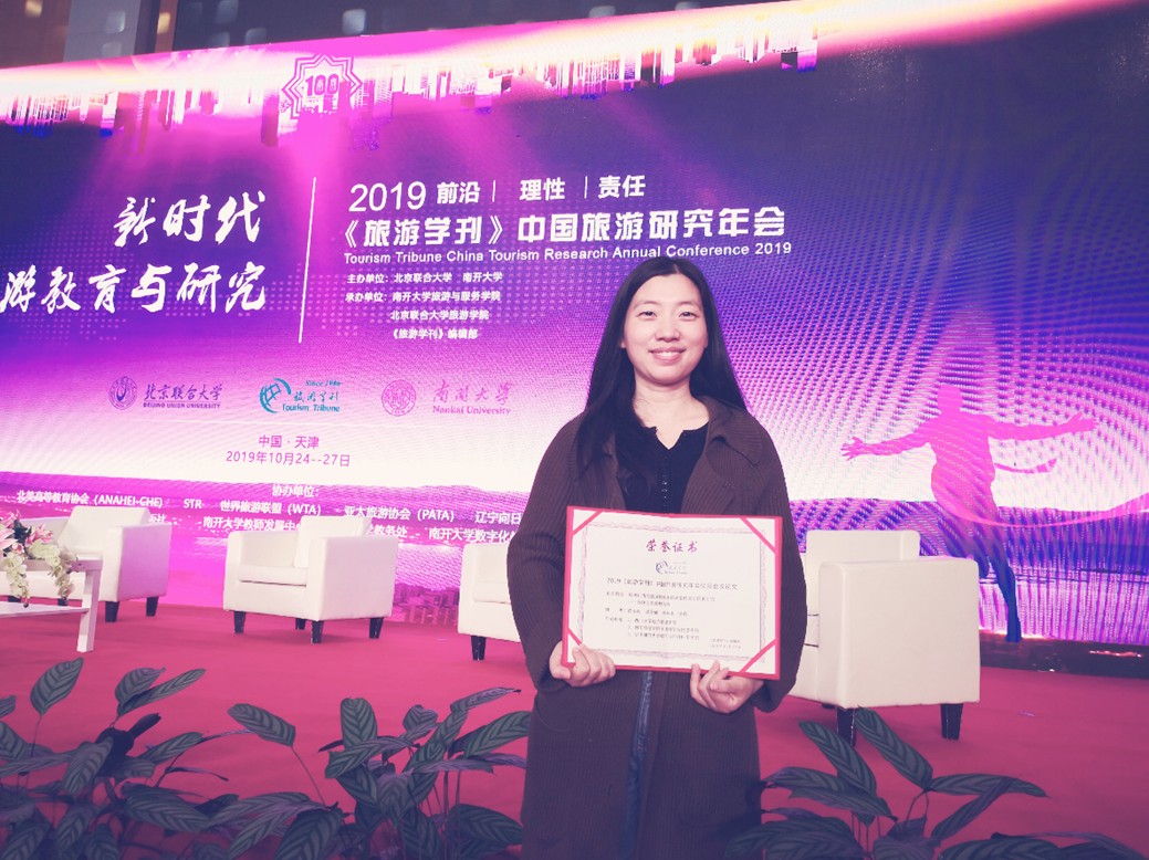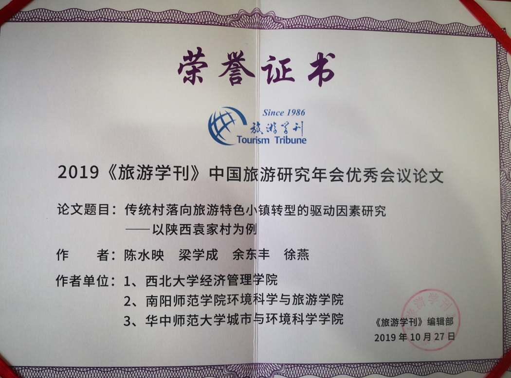 10月26日-27日,由北京联合大学、南开大学主办的“2019《旅游学刊》中国旅游研究年会”在天津南开大学隆重举行。在本次会议上,beat365官网博士生陈水映和导师梁学成教授等共同完成的论文《传统村落向旅游特色小镇转型的驱动因素研究——以陕西袁家村为例》荣获年会优秀论文奖;这也是继beat365官网旅游管理系青年教师褚玉杰之后连续第二次获此荣誉。