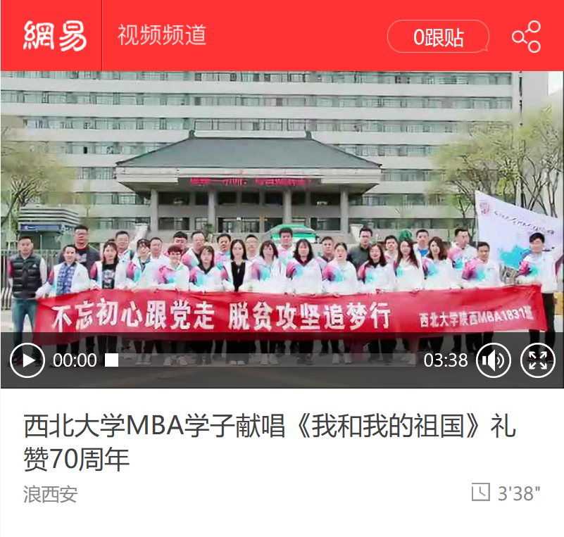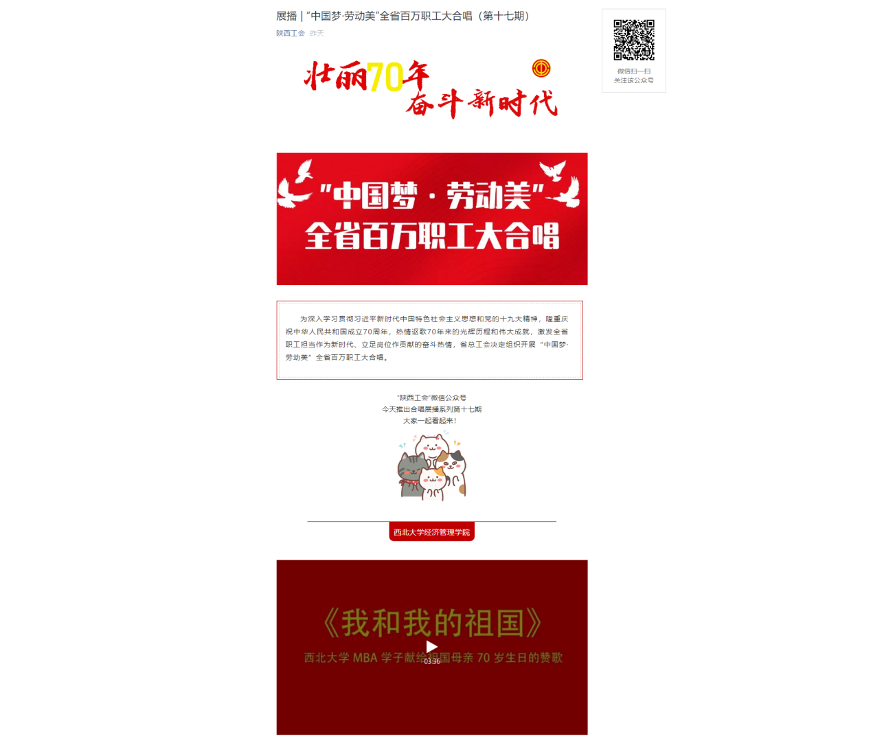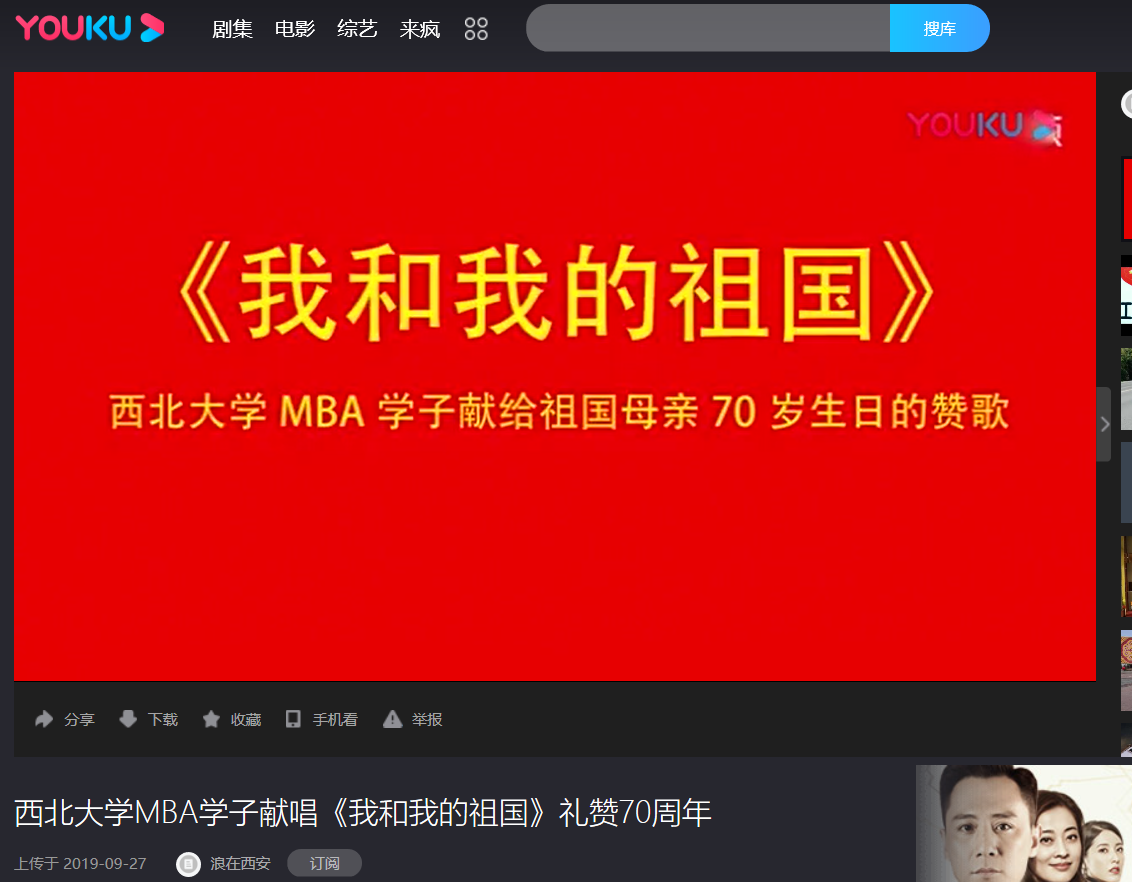 金秋气爽,丹桂飘香。2019年9月21日beat365官网MBA学员唱响《我和我的祖国》,致敬我们伟大的祖国,献礼祖国70华诞。视频在陕西省总工会举办的“中国梦﹒劳动美”百万职工大合唱活动中展播,并在优酷、网易、今日头条等多家媒体网站收录。
