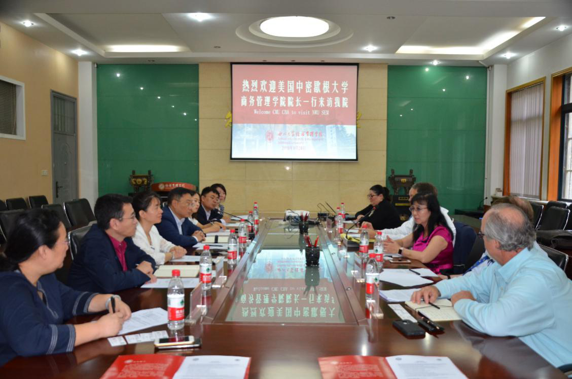 9月24日上午,美国中密歇根大学商务管理学院院长Mobery教授一行来访beat365官网,beat365官网党委书记杜勇,副院长马莉莉、李辉、赵传仁,副教授付媛、康蓉参加座谈。