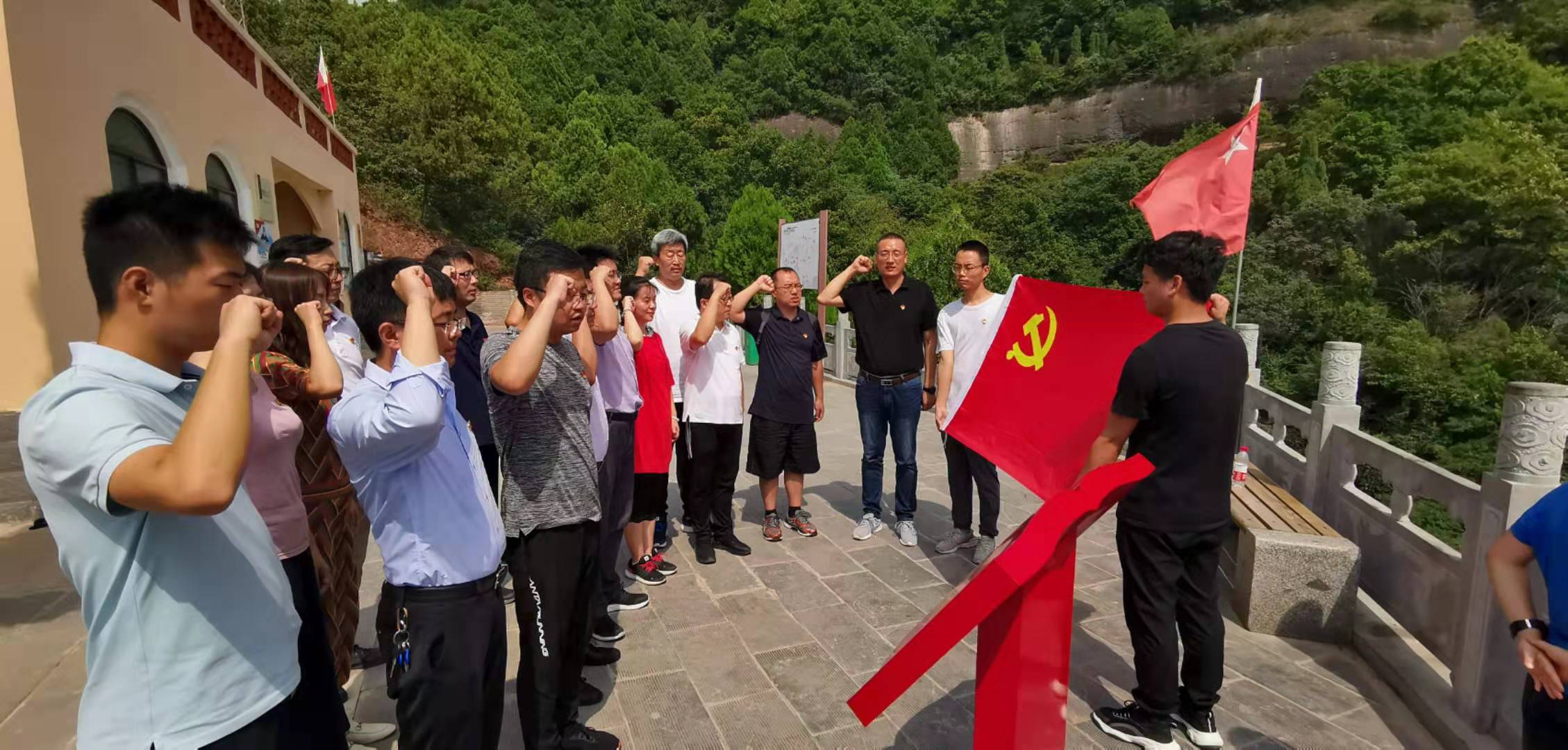 学习活动的第二站是铜川耀州区的薛家寨,是中国工农红军陕甘边游击队一、三支队和党政机关、医院、被服厂、军工厂的驻地。1933年刘志丹、谢子长、习仲勋等老一辈革命家就在这里领导红军开展革命斗争。参加学习活动同志们集体站在陡峭的山崖上,在革命先烈战斗牺牲的地方,面对党旗,紧握右拳,重温入党誓词,响亮的宣誓声回荡在照金上空。沿着革命先烈的足迹登上高高的山崖,参观红军曾经生活、战斗的四个岩洞。岩洞虽已被风雨侵蚀,但是依稀可见红军当年生活工作的痕迹,老一辈红军战士正是在这样艰苦的环境下,坚守革命初心,矢志不渝,制定革命重要决策,制造武器,与凶残的敌人作战,他们不畏艰险的奋斗精神深深感染着每一位党员。