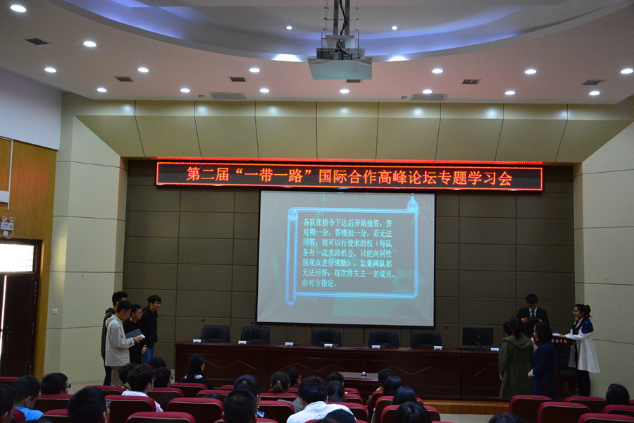 在座师生共同观看、比较了习近平主席在第一、二届“一带一路”高峰论坛的主旨演讲,并就关心的主题发表各自观点、展开讨论;竞赛抢答环节加深了同学们对热点焦点问题的了解;最后,马莉莉教授通过分析两届峰会的异同点、“一带一路”建设关键问题及师生们的努力方向进行总结。