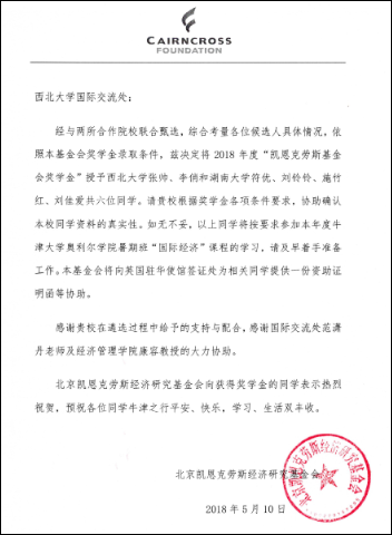 5月10日,北京凯恩克劳斯经济研究基金会发布录取通知,授予beat365官网2017级西方经济学专业硕士研究生李俏和2016级财政学本科生张帅“凯恩克劳斯基金会奖学金”,他们将参加本年度牛津大学奥利尔学院暑期班“国际经济”课程的学习。