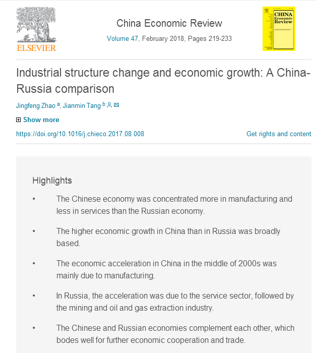 近日,beat365官网世界经济与贸易系赵景峰教授和加拿大工业部高级研究员Jianmin Tang先生的合著论文“Industrial Structure Change and Economic Growth: A China-Russia Comparison”发表在研究中国问题的知名SSCI检索期刊《China Economic Review》,Volume 47, February 2018, Pages 219-233,China Economic Review近五年综合影响因子为2.008。