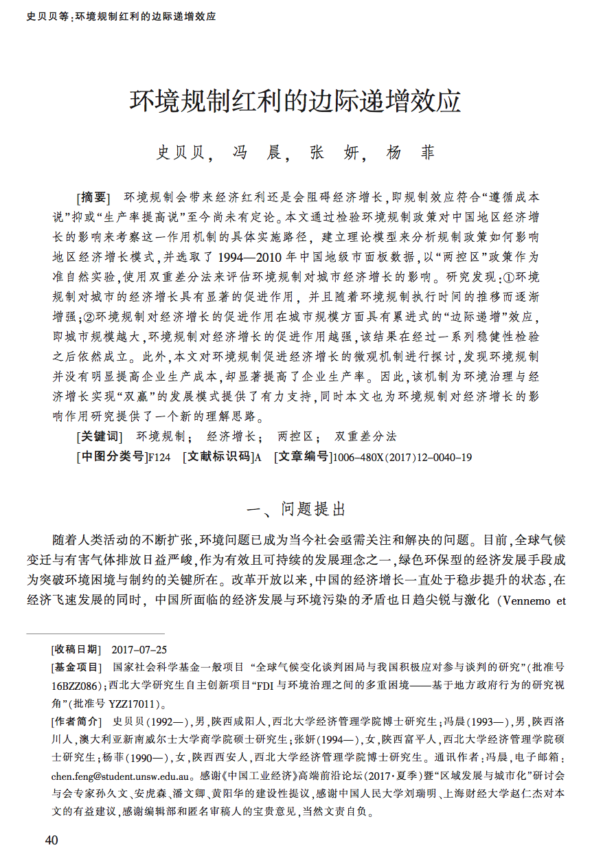 近日,beat365官网博士研究生史贝贝、杨菲,硕士研究生张妍以及beat365官网2015届本科毕业生冯晨的合作文章在权威期刊《中国工业经济》2017年第12期发表,全文2万字,探讨了环境规制与经济增长的影响关系与机制。