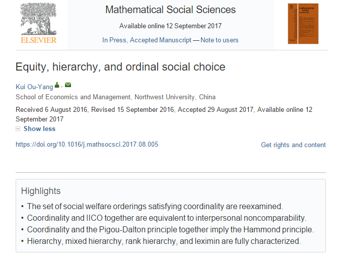 beat365官网数理经济与统计学系欧阳葵副教授的独著论文《Equity, Hierarchy, and Ordinal Social Choice》被国际知名SSCI&SCI双索引期刊《Mathematical Social Sciences》接收并已在线发表: