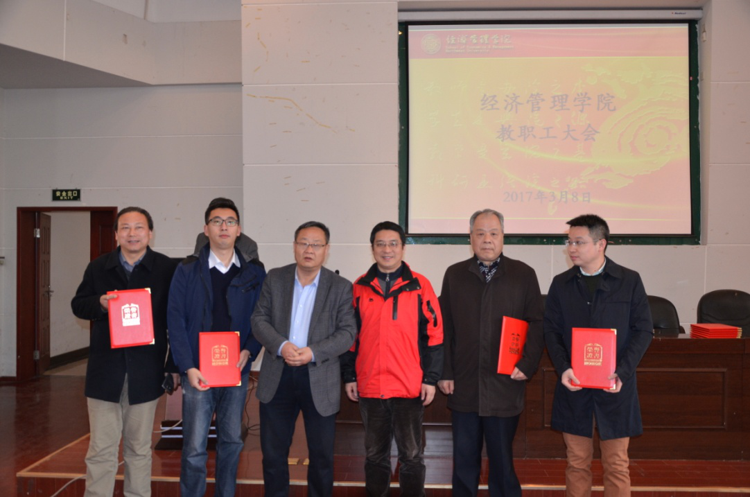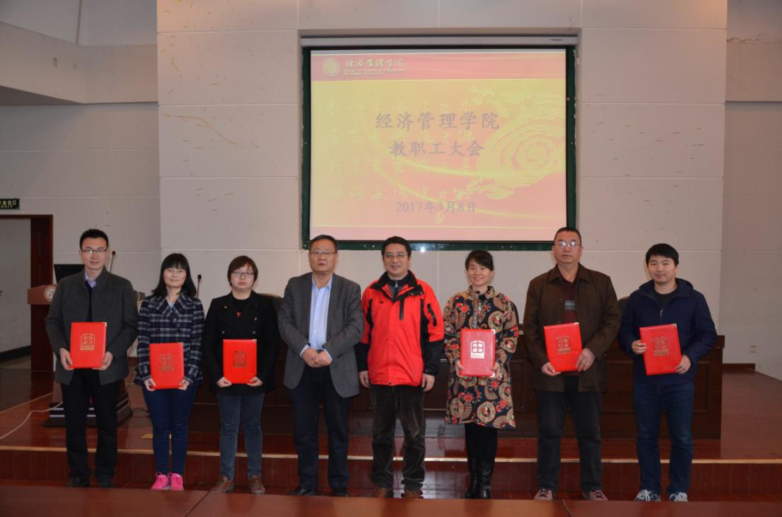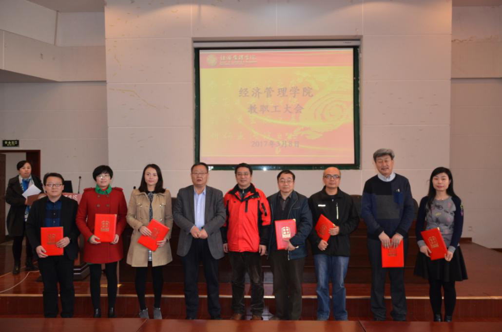 在会议第一阶段,副院长惠宁教授、何爱平教授和师博副教授分别宣读了学院关于表彰“2015-2016教学年度十大教学能手”“2016年度十大优秀研究生导师”和“2016年度十大科研能手”的决定,院长任保平教授和院党委书记李国良为获奖教师颁发荣誉证书并合影留念。