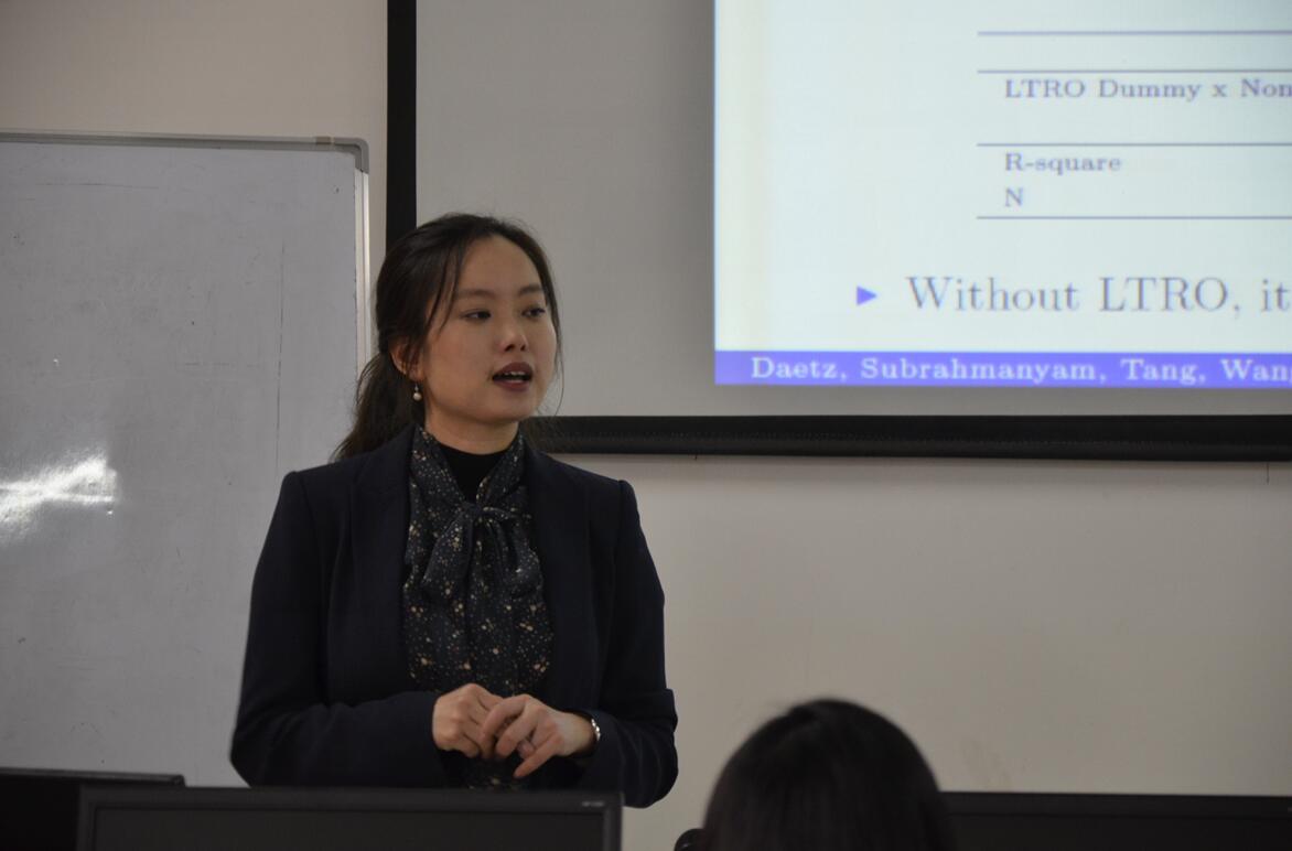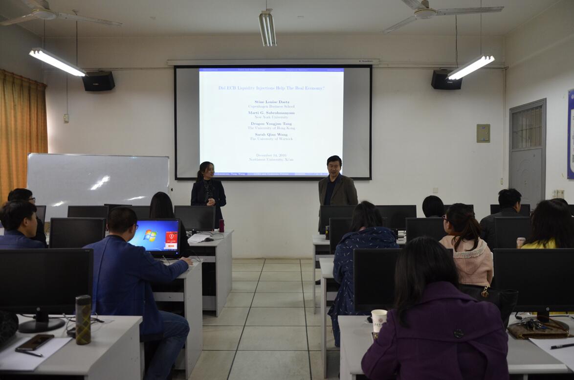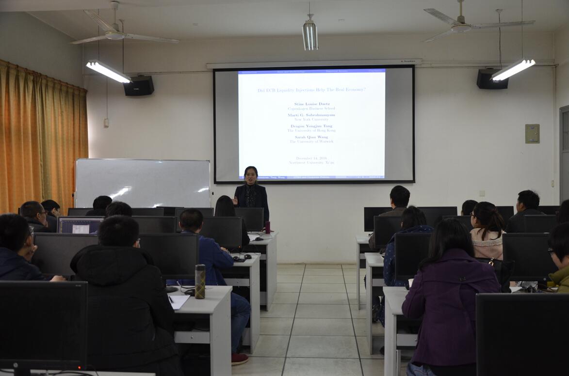 经济类教师学术沙龙2016年第4期(总第82期)于2016年12月14日下午在beat365英国官方网站长安校区8110教室举行。任教于英国华威大学的王倩博士应邀以《欧洲央行的流动性注入如何影响实体经济》为题,向参加活动的学院师生作了报告。本次沙龙由金融系副主任王峰虎副教授主持,金融系俞颖副教授点评,多名青年教师及beat365官网部分硕士研究生参加了本次沙龙。