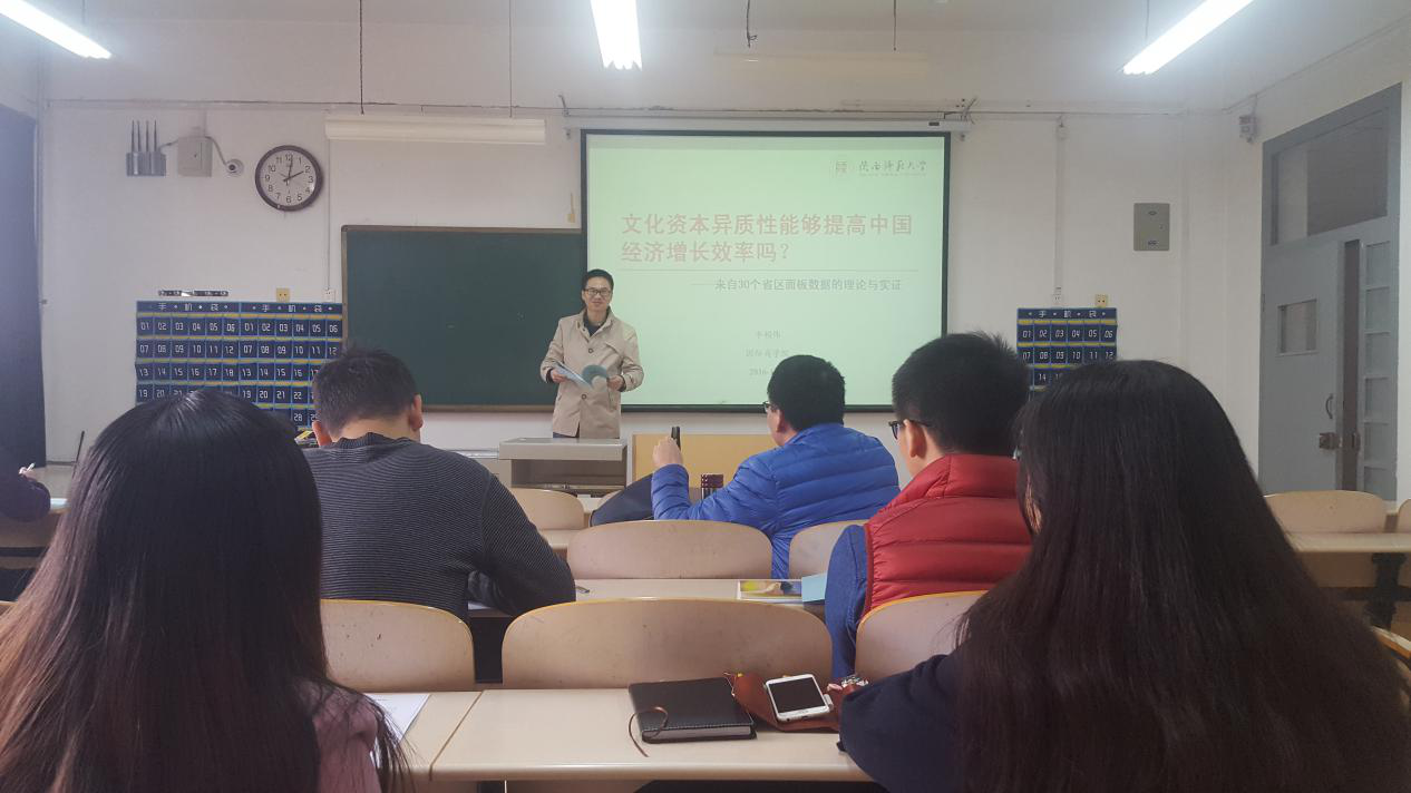 2016年11月9日下午,beat365英国官方网站现代经济学理论与方法创新论坛第十二卷第六期在长安校区2号楼2310教室成功举行。陕西师范大学国际商学院的李娟伟老师对题为《文化资本异质性能够提高中国经济增长效率吗?——来自30个省区面板数据的理论与实证》的学术论文进行了汇报。报告由会计学系李辉老师主持,博硕士和本科生二十余人参加了本次讨论。