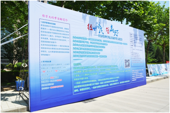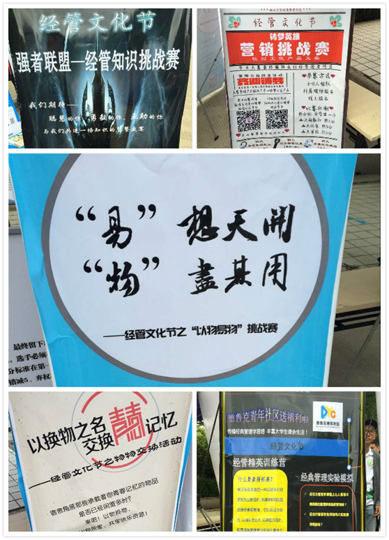 首届经管文化节以“经世济民 管赢天下”为主题,旨在鼓励经管学子“树经世济民之风,园民族复兴之梦”,弘扬经管学科所蕴含的人文情怀,普及经济管理知识。本届文化节设立了6大板块,包括了“易”想天开,“物”尽其用—以物换物活动,包含了挑战赛和换物活动两大部分,重在体现市场交换的意义,同时号召同学合理利用闲置物品,做到低碳环保;铸梦英雄—营销大赛组织同学进行公益创业营销活动;强者联盟—经管知识挑战赛考验的是同学们经济管理知识的储备量;经管精英训练营是由经管学院德鲁克青年社区组织的深受同学喜爱的素质拓展活动,力求传播经典管理学思想,提高学生综合素质。最后还有齐心协力—趣味团队游戏竞赛的部分。活动现场,学院精心制作了宣传展板,详细介绍了各个活动内容和奖项设置,吸引了大量同学咨询参与。