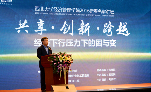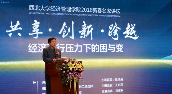 3月25日,由经管学院和陕西省宏观经济研究院举办、经管学院高级管理培训中心承办的“2016新春名家讲坛”在太白校区大礼堂成功举行。本次讲坛以“共享·创新·跨越——经济下行压力下的困与变”为主题,邀请杰出校友、著名经济学家张维迎,全国社保基金副理事长、我校前校长王忠民,致远软件营销副总裁、协同研究院院长刘古权和经管学院院长、陕西省宏观经济研究院执行院长任保平在讲坛上围绕“企业家精神”、“供给侧改革”和“协同共享发展”作了演讲。校长郭立宏在活动中讲话,党委副书记、副校长、博士生导师贾明德主持了讲坛。陕西省发改委副主任刘迎军和发改委相关部门负责人出席了讲坛,经管学院和校内其他院系600余人聆听了讲座。