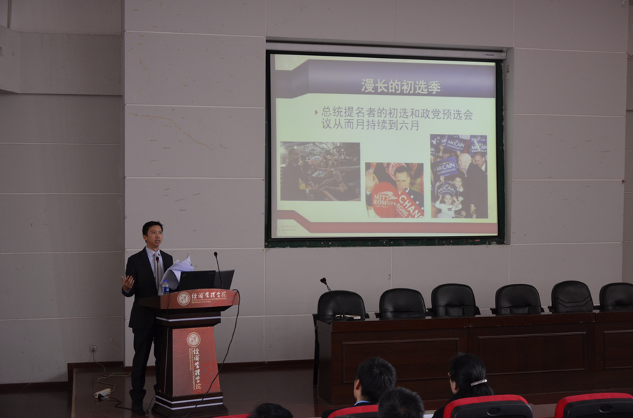 讲座中,Nelson博士就美国的政党制度、选举制度以及2016美国大选的形势向在场学生作了较为详细的讲解,同时还介绍了很多有关美国文化的知识,本场讲座内容丰富详实,帮助学生学习了解了目前国际政治经济的发展大势,极大的开阔了广大学生的国际视野。