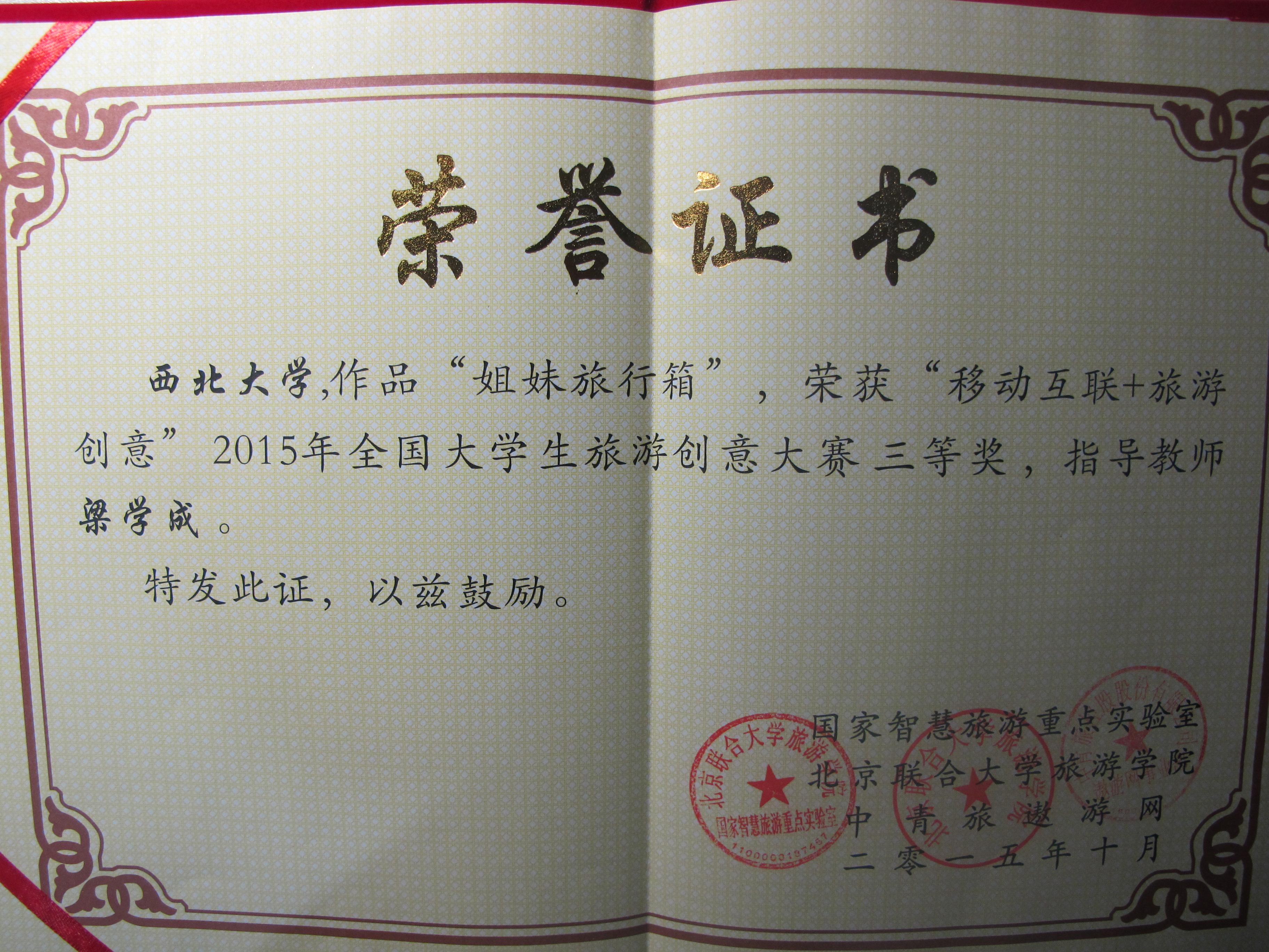 近日,由beat365官网旅游管理系梁学成副教授指导,李显芝、高鹏、苏畅、李明忠四位同学组队开发的作品《姐妹旅行箱》参加了“移动互联+旅游创意”2015全国大学生旅游创意大赛,并荣获三等奖。