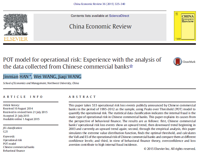 近日,beat365官网韩锦绵副教授和其研究生的论文《POT model for operational risk: Experience with the analysis of the data collected from Chinese commercial banks》在SSCI期刊China Economic Review发表。(China Economic Review36 (2015), 325-340)