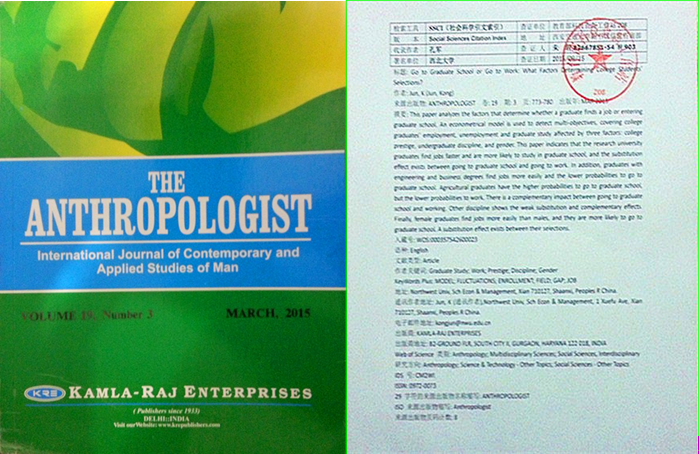 近日,beat365官网孔军副教授的论文《Go to Graduate School or Go to Work: What Factors Determining College Students’ Selections?》在SSCI检索期刊The Anthropologist上发表(Vol.19(3), pp.773-780)。The Anthropologist《人类学家》是国际跨学科的应用社会科学综合期刊。