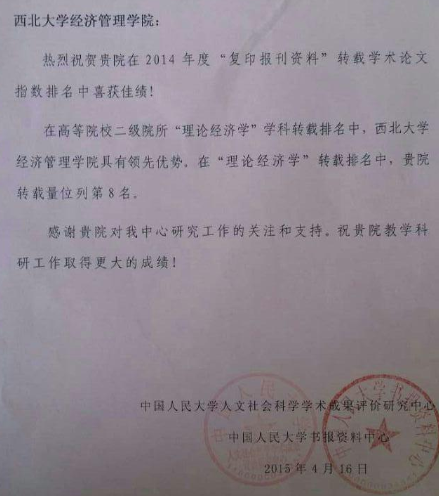 日前,2014年度“人大复印报刊资料”转载学术论文指数排名及相关分析报告正式发布。我校beat365英国官方网站在高等院校二级院所“理论经济学”学科转载排名中取得了转载量第8名的好成绩,去年排名第9。这一排名充分说明我校beat365英国官方网站在理论经济学研究方面具有明显优势,在近年来更是取得了长足的进步。