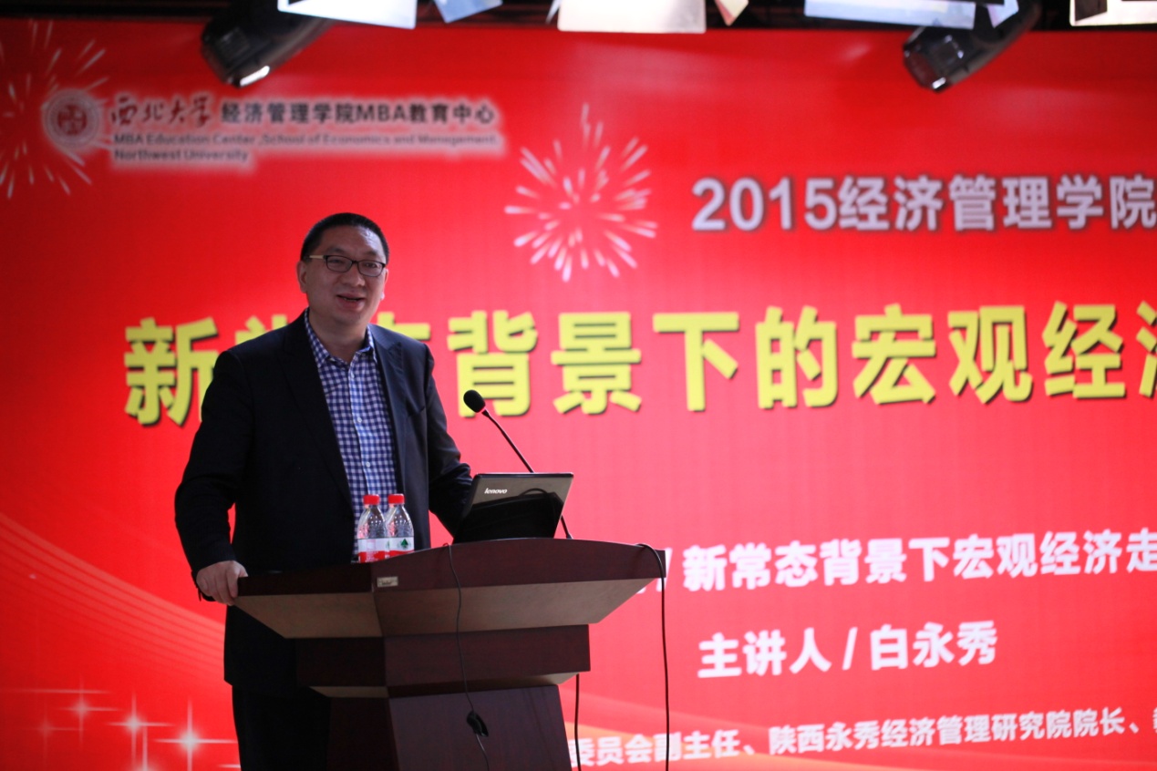 白永秀教授演讲的题目是《经济新常态下的宏观经济走势》,他围绕什么是新常态、如何理解新常态、如何适应新常态以及如何引领新常态进行了深入探讨,他指出,2015年中国经济将面临“五期叠加”的发展大环境,即增长速度换挡期,结构调整阵痛期,前期刺激政策消化期,产能过剩显现期,政府宏观调控转型期。2015年是“五羊开泰”年—羊年成为“五个全面年”,即全面深化改革的关键年,全面推进依法治国的开局年,全面启动一带一路的建设年,全面完成“十二五”规划的收官年,全面进行“十三五”发展的筹划年。2015年是全面进入经济新常态的初始年与互联网产业加速年。要认识新常态,适应新常态,引领新常态;要研究互联网的本质与发展趋势,应对互联网的挑战,发展互联网产业。白永秀教授最后指出了2015年中国宏观经济基本走势,增速稳中有降;房价保持微降;物价温和上涨。