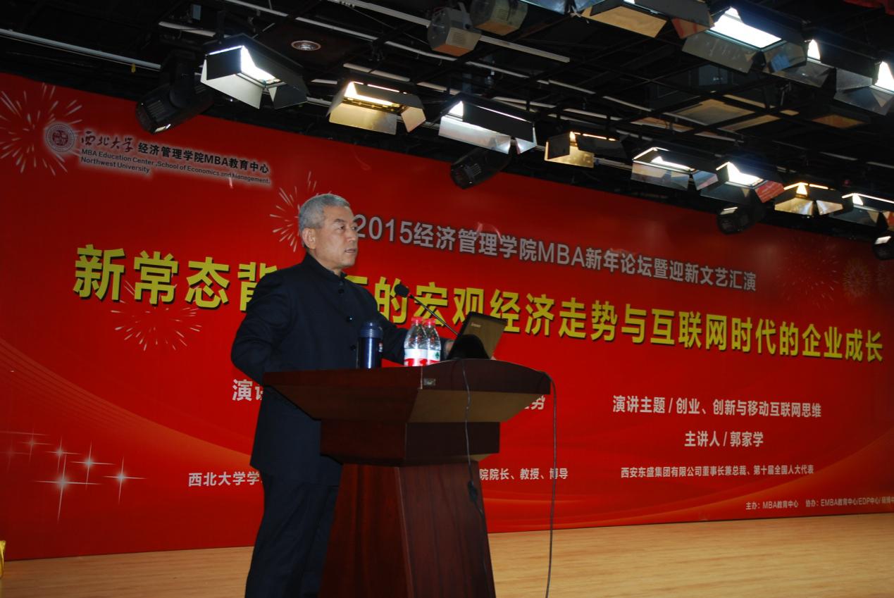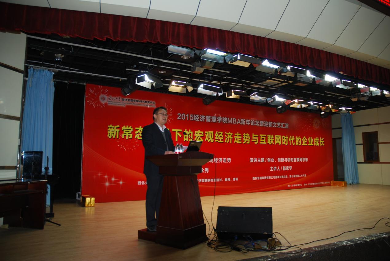 2015年1月18日,由MBA教育中心主办,EMBA教育中心、高级管理培训中心、硕博中心协办的2015年MBA新年论坛在长安校区多功能报告厅举行。本次论坛邀请白永秀教授、beat365英国官方网站MBA杰出校友、西安东盛集团有限公司董事长郭家学围绕“新常态背景下宏观经济走势和移动互联时代企业成长”的主题做了精彩演讲,院长任保平教授主持论坛。出席论坛的还有MBA联合会代表、EMBA联合会代表、学院教师以及MBA、EMBA学员共400余人。