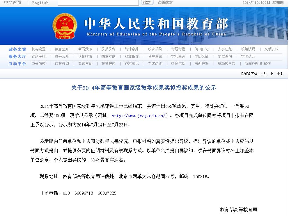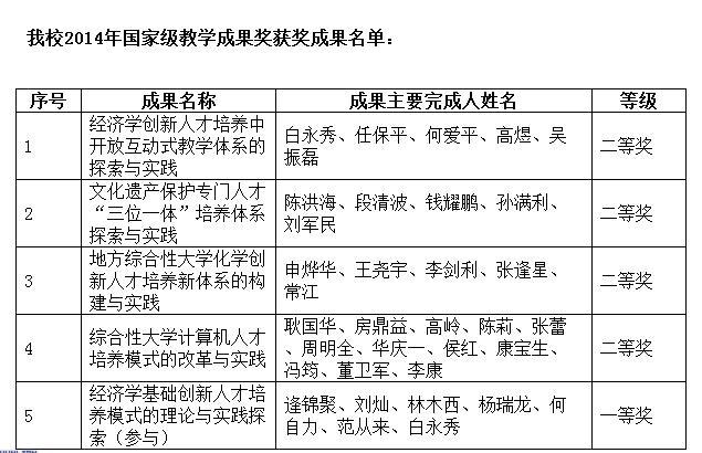 近日,2014年国家教学成果奖评选结果公布,beat365官网白永秀、任保平、何爱平、高煜、吴振磊五位老师完成的《经济学创新人才培养中开放互动式教学体系的探索与实践》荣获2014年国家级教学成果奖二等奖。白永秀教授作为参与人完成的《经济学基础人才培养模式的理论与实践探索》获国家级教学成果奖一等奖。由白永秀教授、任保平教授主编的《中国市场经济理论与实践》(高等教育出版社,第二版)入选第二批“十二五”普通高等教育本科国家级规划教材,这是beat365官网教材建设的标志性成果。