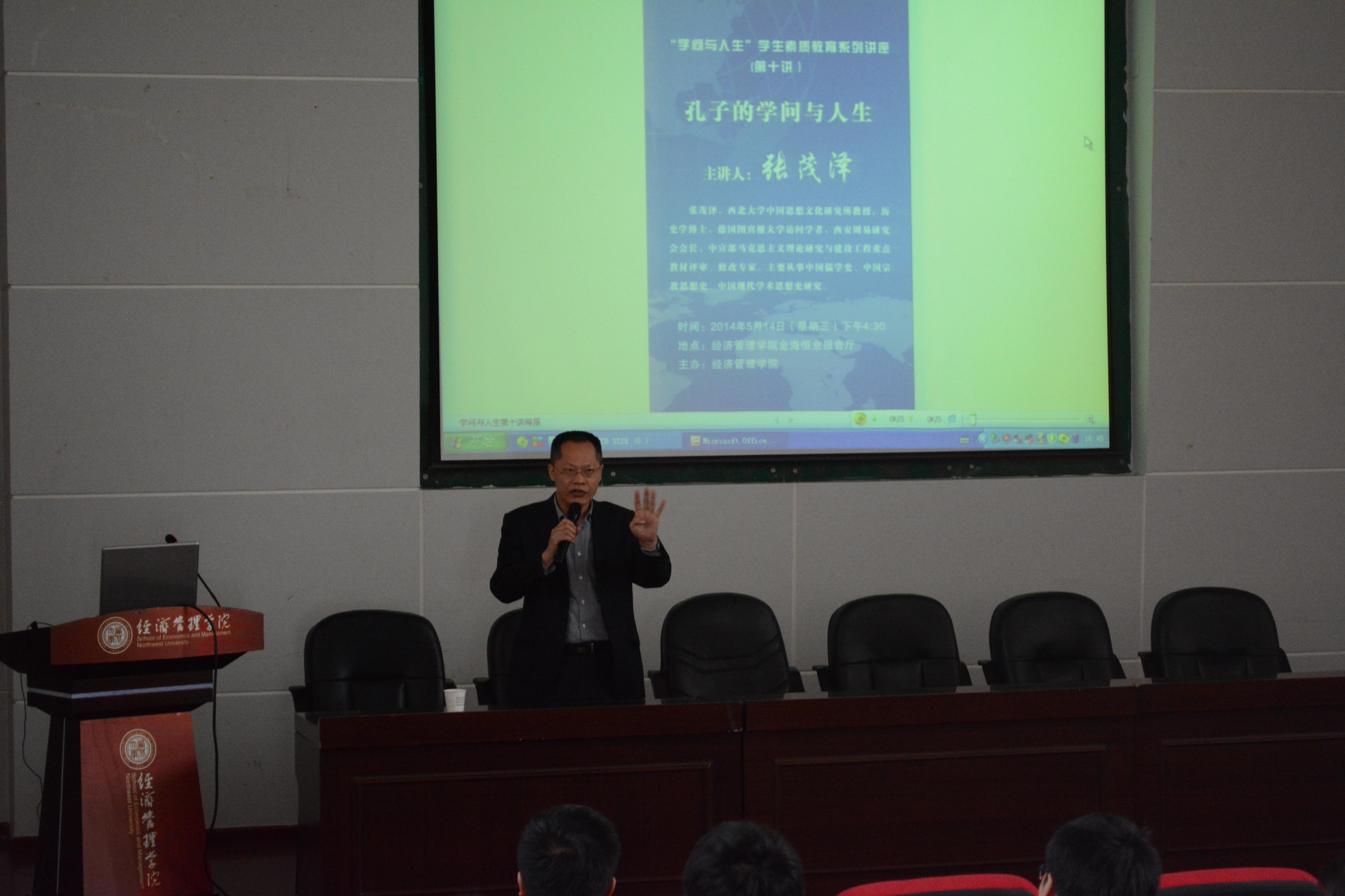 5月14日下午4:30,beat365官网“学问与人生”素质教育系列讲座第十讲在金海恒业报告厅举行,我校中国思想文化研究所张茂泽教授应邀作了题为《孔子的学问与人生》的讲座。讲座由院党委书记李国良主持,副书记李一凡、部分辅导员和本科生共200余人到现场聆听了报告。