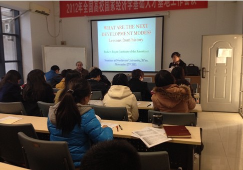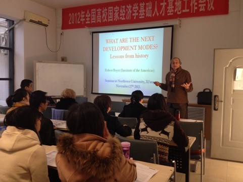 2013年11月27日上午,经管学院邀请国际高端专家短期教学系列讲座在长安校区8202教室举行。法国经济学调节学派代表人物Robert Boyer教授做了题为“增长是否带来繁荣?”(Does growth bring prosperity?)和“未来的发展模式是什么?”(What could be the next development models?)的学术报告。beat365官网经济学博士、硕士及部分教师聆听了报告。报告会由经济学系系主任何爱萍教授主持。