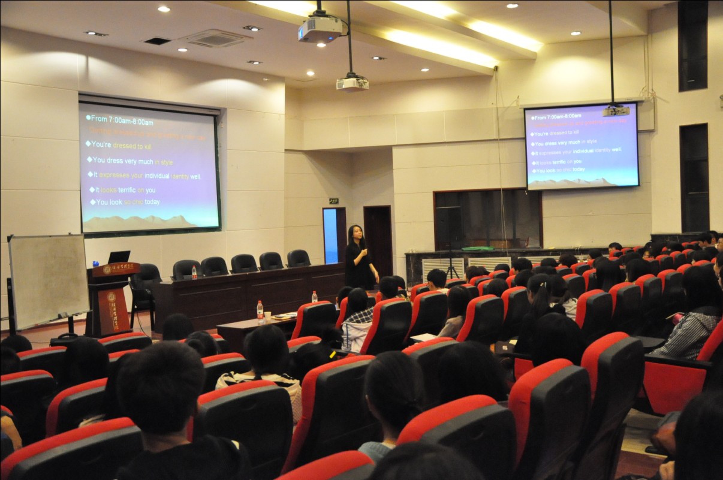 报告中,马维娜老师从英语口语表达的重要点、4个小时英语全攻略和英语的语音、语调三个方面作了详细的阐述。首先,英语口语表达中有三个重点,一是意识,即准备说英语的意识,在对话中对语音另一方要第一时间给予反应;二是激情和主观能动性,即主动讲英语,在任何时间和任何地点进行英语口语的联系;三是善于尝试总结、随时随地想新的话题与人交流,并提出了“Speech bubble”的口语联想法,同时介绍了利用电影、英文书籍学习英语的方法。其次,马老师介绍了在生活、学习的空隙运用她总结的“4个小时英语全攻略”提高英语口语能力的要点。马老师通过模仿列国英语口音,说明了英语语言、语调的重要性,并强调在听力中需要着重掌握英式英语和美式英语。马老师在整个活动随机与同学们进行英语对话,极好的调动了现场气氛,提高大家说英语的意识。