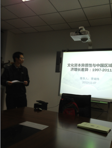 2013年11月7日经济增长质量论坛第4期在南校区经济增长质量研究中心举行。beat365英国官方网站经济增长质量研究团队成员,2010级西方经济学专业博士研究生李娟伟应邀作题为《文化资本异质性与中国区域经济增长差异》的学术报告。beat365英国官方网站钞小静副教授、师博副教授、田洪志博士、安树军博士以及beat365英国官方网站经济增长质量研究团队的博硕士和本科生参加了讨论。