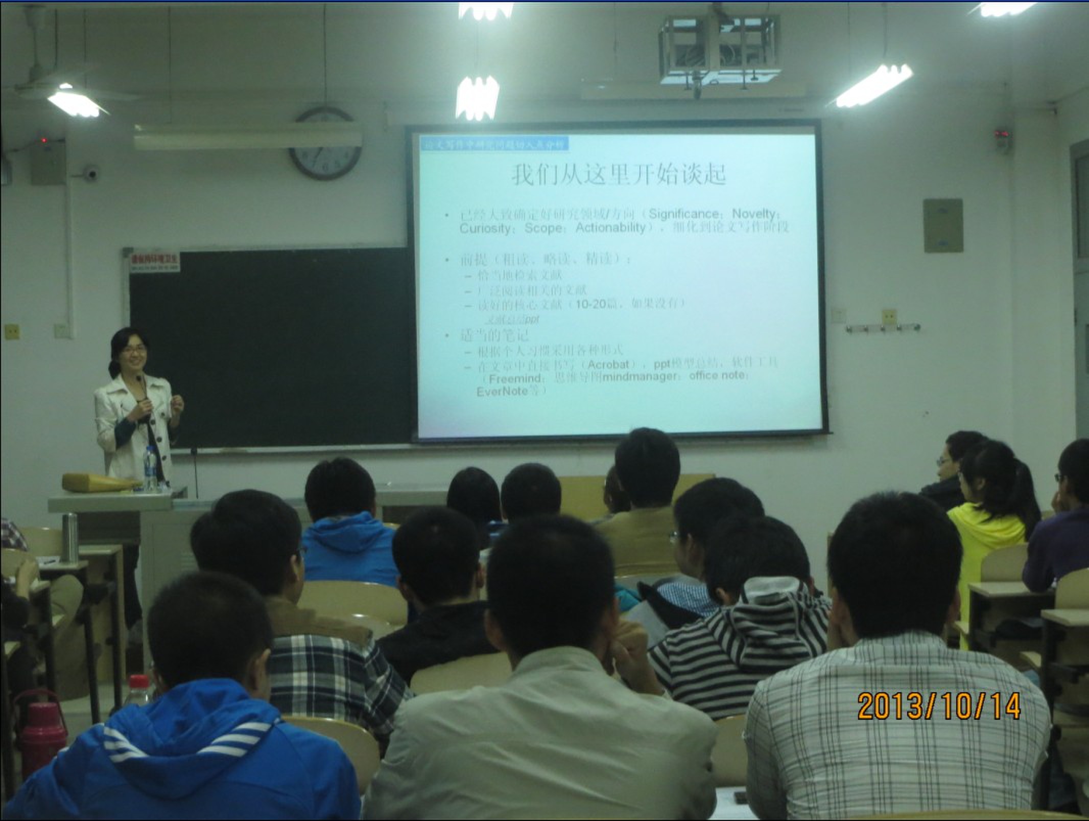 在近两个小时的演讲中,老师幽默风趣的语言、适当的举例与比较、外文文献的重点讲解以及结合的视频播放,更形象生动的让同学们领会了老师的内容与思路。在座的同学们都积极踊跃发言,与老师形成了很好的互动,同时也营造了一种很好的学术氛围,大家一起在愉悦轻松的环境中度过了这个难忘的夜晚,这一晚的讲座,更让在场的每一位同学都受益良多。