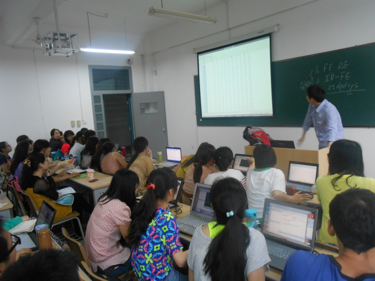 李娟伟首先介绍了面板数据在Stata软件中的预处理问题,明确了利用Stata软件进行数据分析的基本步骤;其次,着重讲了面板数据中固定效应和随机效应的处理方法,并对相关结果进行解释;最后,介绍了当存在内生性问题时,选取工具变量的方法以及注意事项。在讲座过程中,自带电脑的同学都按照李娟伟博士讲述的步骤实际操作,并针对自己操作过程中遇到的问题和操作结果进行提问,未带电脑的同学也认真做笔记,并对不懂的问题踊跃提问,整个讲座过程讨论十分热烈。