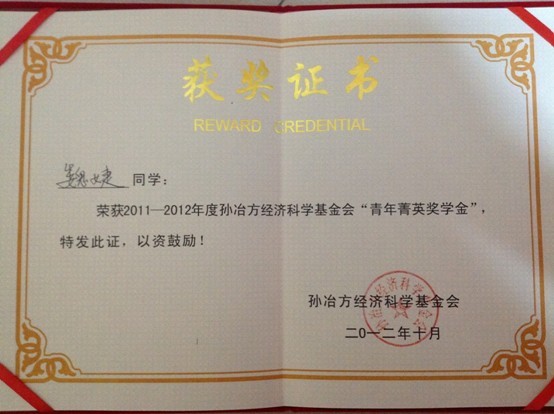 beat365官网2010级西方经济学博士生魏婕于2012年2月通过申报材料初审,被选为该奖候选人。后于2012年3月至9月在中国社会科学院城市与竞争力研究中心实习。在实习期间参与《中国城市竞争力报告No.10》主报告的编写工作并任该书的主编助理,另参与了相关课题、学术研究以及会议等工作。由于实习期表现优异,受到一致好评,于2012年10月魏婕博士被授予2011-2012年度孙冶方经济学基金会“青年菁英奖学金”。