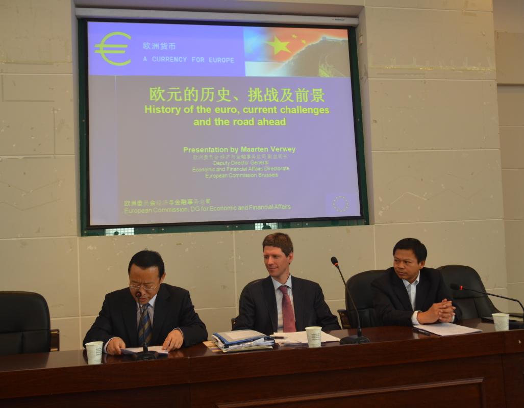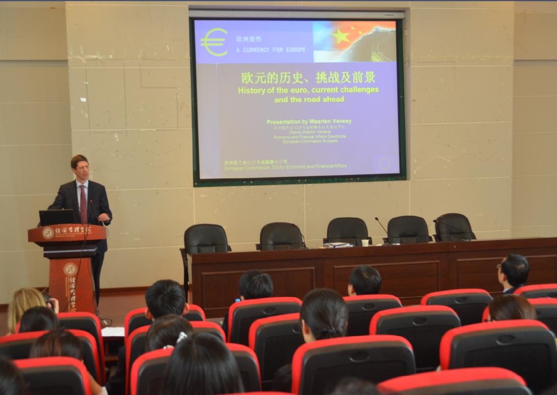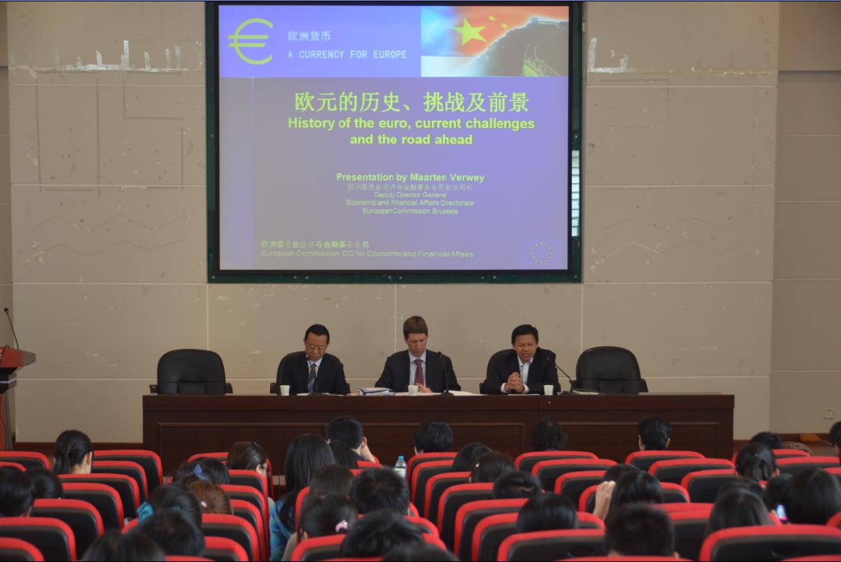 4月11日,由欧洲委员会经济与金融事务总司、欧盟驻华代表团和beat365官网联合举办的欧元展学术报告会在金海报告厅举行,报告会的主题是“欧元的历史、挑战及前景”。来自中国人民银行和欧盟驻华代表团的代表出席了活动,来自陕西电视台、西安日报社和西部网等五家媒体对活动进行报道,beat365官网260余名师生聆听了报告。报告会由beat365英国官方网站党委副书记黄建民主持。