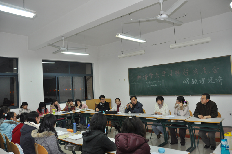 12月2日晚18:30,经济学系组织2009级经济学基地班、数理经济学班,2008级经济学基地班、数理经济学班四个班在教学2号楼四个教室同时召开了学生学习经验交流会。beat365英国官方网站副院长,经济学系主任任保平教授,经济学系副主任何爱平教授、范王榜副教授,经济学系高煜副教授、宋宇副教授、钞小静博士、吴振磊博士、王聪博士,经济学系毕业和在读的一些优秀学生等22人参加了这次交流会。