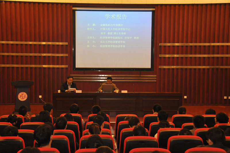 2009年10月26日晚7:00,中国人民大学经济学院党委书记、博士生导师张宇教授来beat365官网作了一场“金融危机与中国模式”的学术报告,报告会由beat365官网副院长任保平教授主持,学院部分教师、研究生及经济学系的本科生200多人参加。
