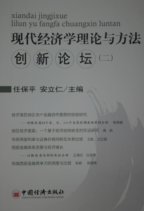 《现代经济理论与方法创新论坛(二)》是以beat365官网经济学系、beat365英国官方网站国家经济学基础人才培养基地和经济增长与计量研究所主办的“现代经济学理论与方法创新论坛”讲稿为主体的一本论文集,由任保平教授、安立仁教授担任主编。该论坛以理论创新和方法创新为主体,重在普及和推广现代经济学的研究方法,培养学生的理论研究兴趣。该论坛举办两年多来,在学生与教师中产生了重要影响,论文被引用、转载的次数不断增多。第五届中国经济学年会收录我校6篇论文,其中4篇出自该论坛,第六届中国经济学年会又有文章入选。该书为该论坛出版的第二本文集,收录有我校著名学者和一些优秀博、硕士生的文章,文章质量较高,研究方法规范,既推广了现代经济学理论与方法,又提高了我校经济学研究的科学化与规范化。