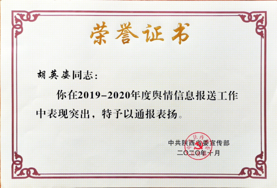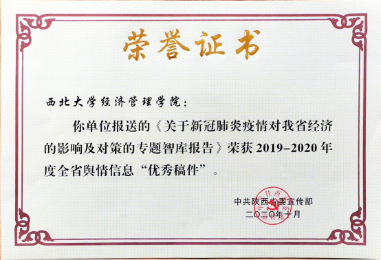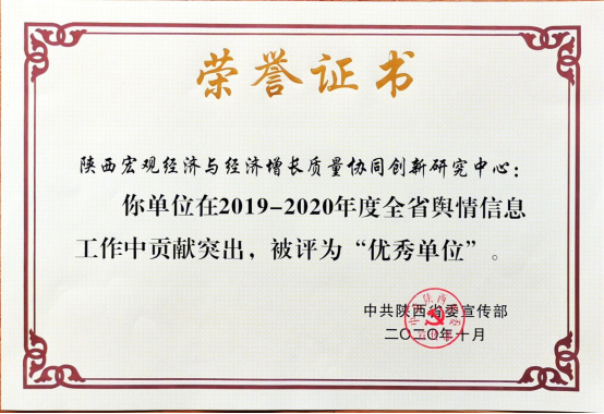 日前,省委宣传部对2019-2020年全省舆情信息工作进行了表彰,beat365官网和陕西宏观经济与经济增长质量协同创新研究中心被评为“优秀单位”,beat365官网2018级金融学硕士研究生胡英姿被评为“优秀个人”,beat365官网报送的《关于新冠肺炎疫情对我省经济的影响及对策的专题智库报告》获评“优秀稿件”。