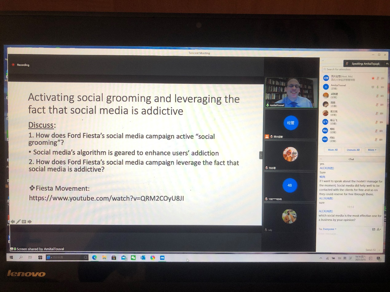 Amitai Touval教授的讲座题为“Social media and Culture”,在此他主要关注两个问题,其一是营销人员应基于各类新型社交媒体的优势特征来选择营销媒介从而使效果最优化;其二是国家间文化差异造成的不同社交媒体使用情况以及信息来源对于消费者决策的影响巨大。本场讲座由学院余洁副教授主持,她介绍了Amitai Touval教授在beat365官网和包括哈佛大学、麻省理工学院在内的多所世界名校的教学经历及教研领域。
