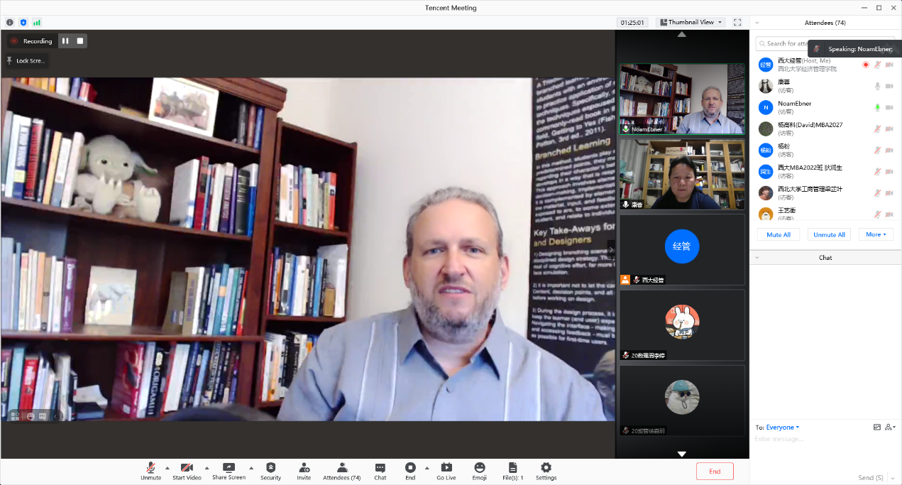 Noam Ebner教授的讲座题为“Online negotiation”,他重点讲解了自上世纪90年代初期以来新科技革命的发展和信息技术的广泛应用对于“谈判”的影响,通过运用沟通理论及具体场景分析各类现代媒介的优劣势,从而为沟通者进行最佳媒介选择提供建议。本场讲座由康蓉副教授主持,她介绍了Noam Ebner教授在跨学科领域研究的突出贡献,并赞同其关于“非正式谈判”概念的提出与在教学实践中的应用。