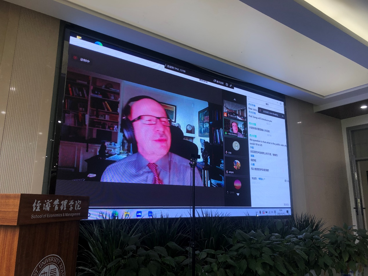 John Komlos教授的讲座题为“The Economy of U.S. after the Covid-19”,他通过一组数据从政治、军事、思想、种族、教育、就业等方面全方位分析了后疫情时代威胁美国经济社会的22个难以调和的结构性问题,并说明步入新的历史阶段后,学界、政府应积极调整、运用适应新常态的经济理论来制定新政策以解决经济社会中的结构性问题。本场讲座由学院宋宇教授主持,他介绍了John Komlos教授的任职情况、研究领域及学术贡献等情况。