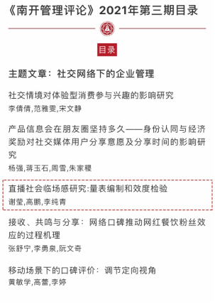 近日,经管学院由李纯青教授带领的数字化营销团队在国内权威期刊《南开管理评论》2021年第三期上发表了题为《直播社会临场感研究:量表编制和效度检验》的主题文章。