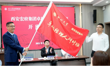 会上,郭亚军代表beat365英国官方网站为卓越经理人成长研修班授旗。宏金公司副总经理英闯、物业公司副总经理王颖作为学员代表上台发言。
