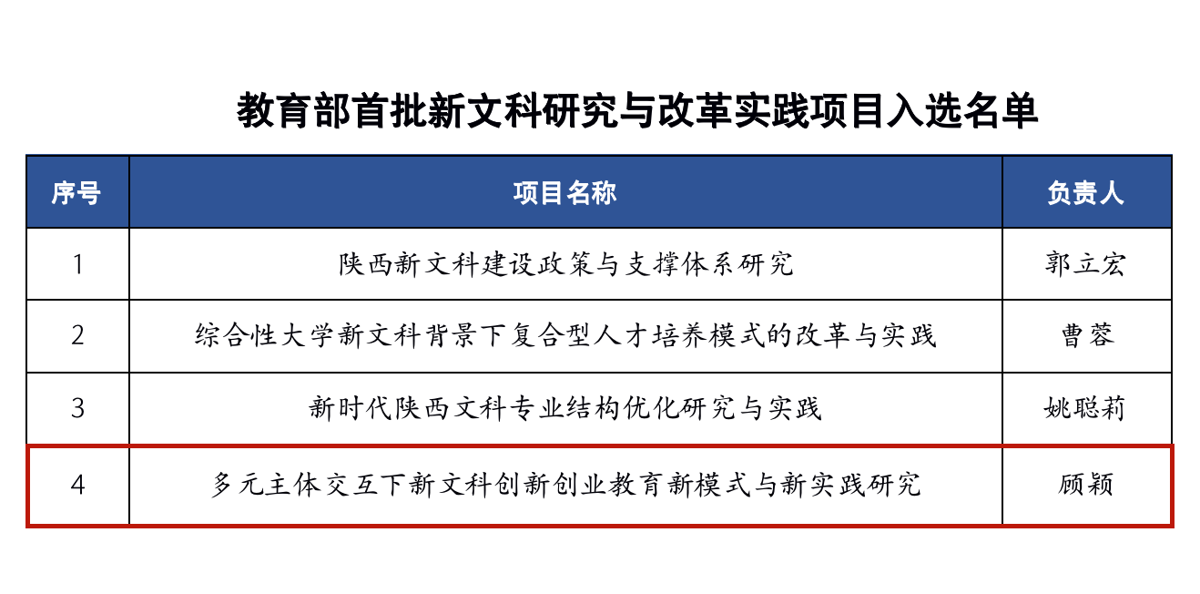 近日,教育部公布首批新文科研究与改革实践项目,beat365官网顾颖教授负责的《多元主体交互下新文科创新创业教育新模式与新实践研究》项目入选,我校共获批4项。新文科研究与实践项目是贯彻全国教育大会精神,落实教育部新文科建设工作会议要求,全面推进新文科建设,构建世界水平、中国特色的文科人才培养体系的重要举措。学院将围绕“十四五”规划,全面深化教育教学改革,促进专业结构和课程体系的优化升级与交叉融合,完善本科专业人才培养方案,推动本科人才培养水平再提升。