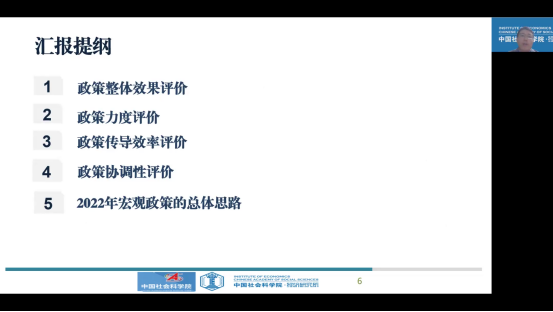 接着陈老师详细介绍了不同维度下的政策评价情况,从政策整体效果来看,2021年宏观经济政策在经济稳定方面实现了较好地效果,完成了年初制定的各项主要目标,但是,2021年下半年中国经济下行压力有所加大,宏观政策在经济稳定方面的效果仍需提升,这样才能更好地应对“三重压力”;在金融稳定层面,2021年部分金融风险得到有效控制,系统性风险整体改善,但是一些潜在的金融风险仍需高度关注。同时,还对货币政策和财政政策分别构建了评价指标体系,通过计算政策力度指数更加科学和直观地反映相关政策力度,利用政策传导机制示意图分析了政策传导效率,最后给出了2022年宏观政策的整体思路。