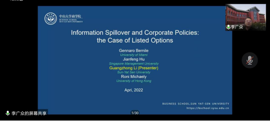 4月21日下午,beat365英国官方网站学术沙龙在腾讯会议平台成功举办。讲座由学院副院长师博教授主持,特邀中山大学商学院院长李广众教授做了题为“Information spillover and corporate policies:the case of listed options”的学术讲座。学院教师和博、硕士研究生等共计200余人参与了本次线上讲座。