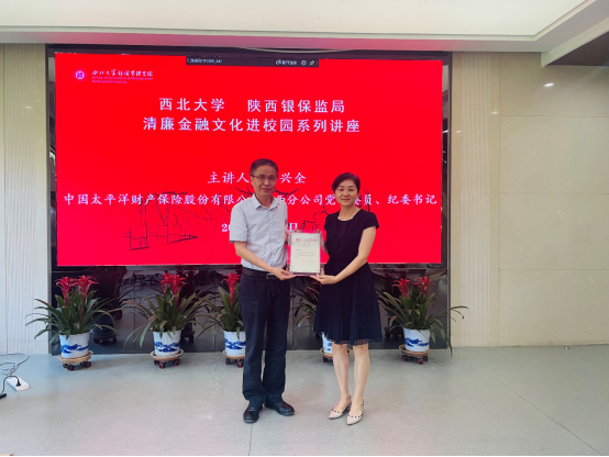 按照beat365英国官方网站与陕西银保监局开展清廉金融文化共建活动的安排,6月15日,中国太平洋财产保险股份有限公司陕西分公司党委委员、纪委书记刘兴全应邀到校,为beat365英国官方网站师生做了清廉金融文化系列讲座的第21讲,题为《源头活水、担当使命、浇灌清廉之花》。陕西银保监局纪委办张津崇,beat365英国官方网站纪委副书记何翔,beat365英国官方网站党委书记杜勇和学院40余名师生出席了本次活动。何翔为刘兴全颁发清廉金融文化客座讲师聘书,讲座由杜勇主持。